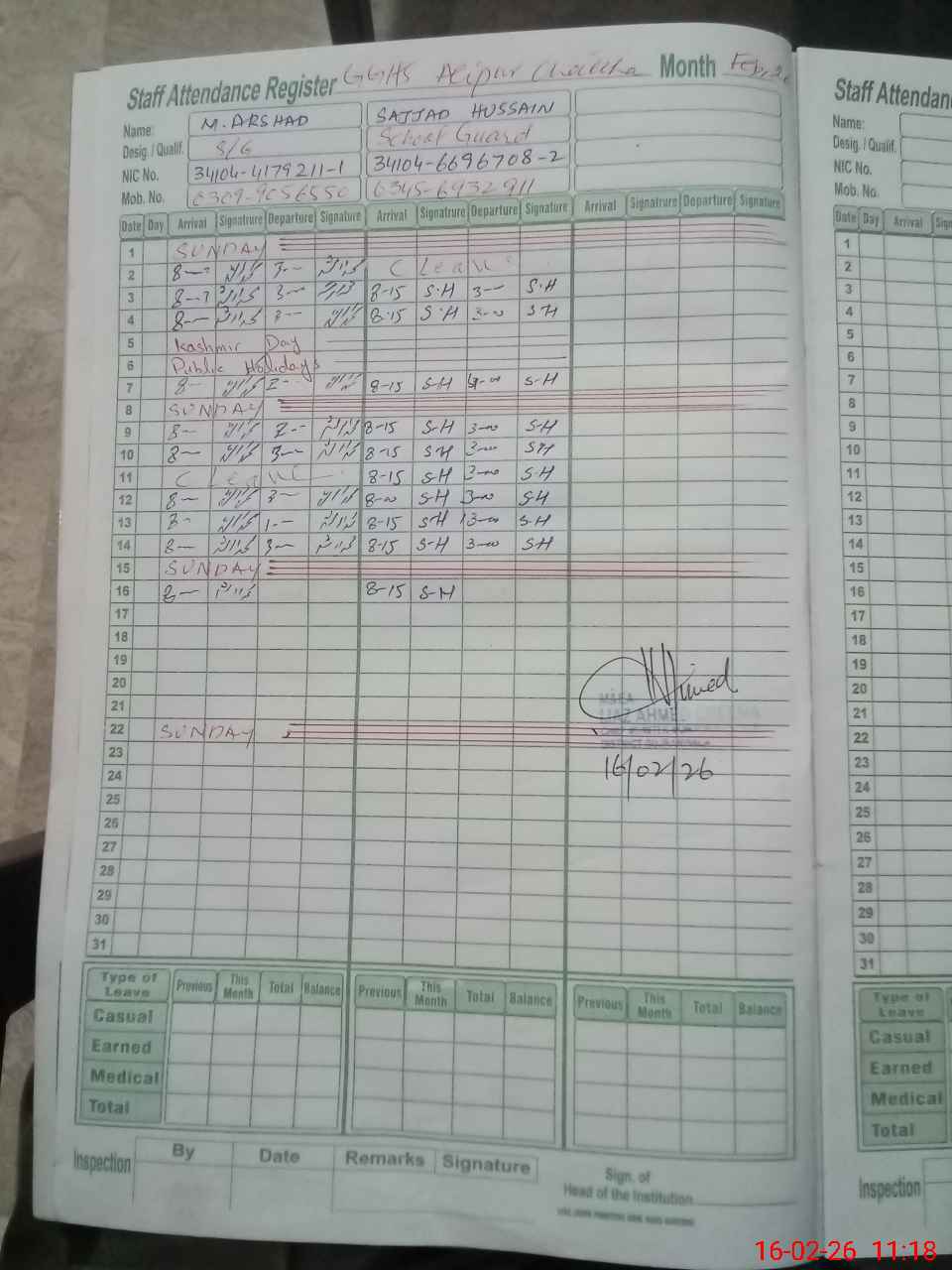 | 34**** | Na**** An**** | PRINCIPAL | Regular | 0 | 0 | 0 | 0 | 0 | 0 | 0 | 0 | 0 | Casual |