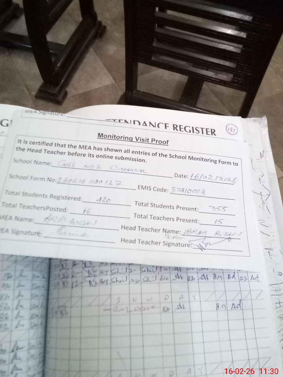 | Attendance Register | Head Teacher | MEA with School | Visit Proof |