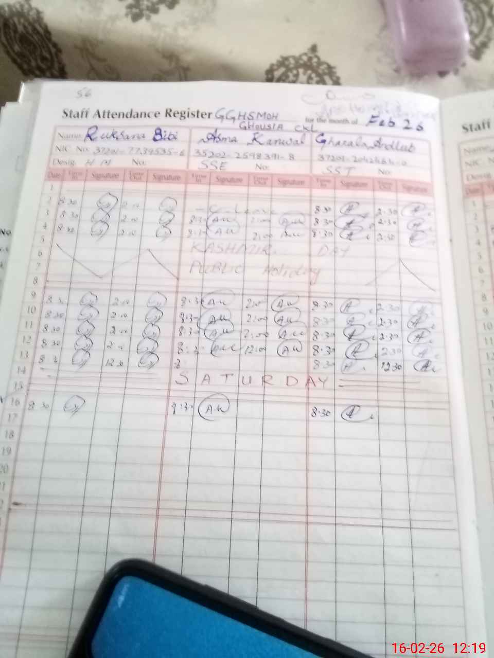 | CNIC | Full Name | Designation | R/C | Absence during last cal. month |