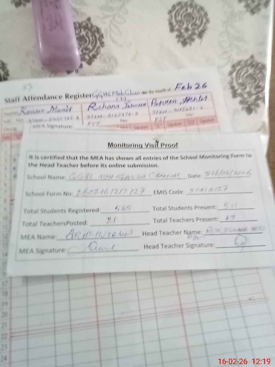 | Attendance Register | Head Teacher | MEA with School | Visit Proof |