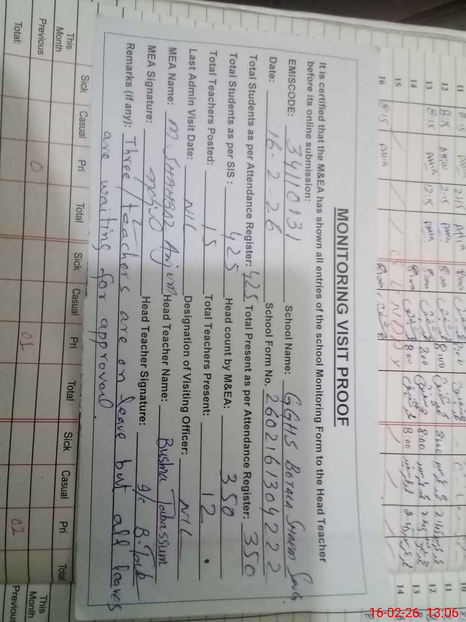 | Attendance Register | Head Teacher | MEA with School | Visit Proof |