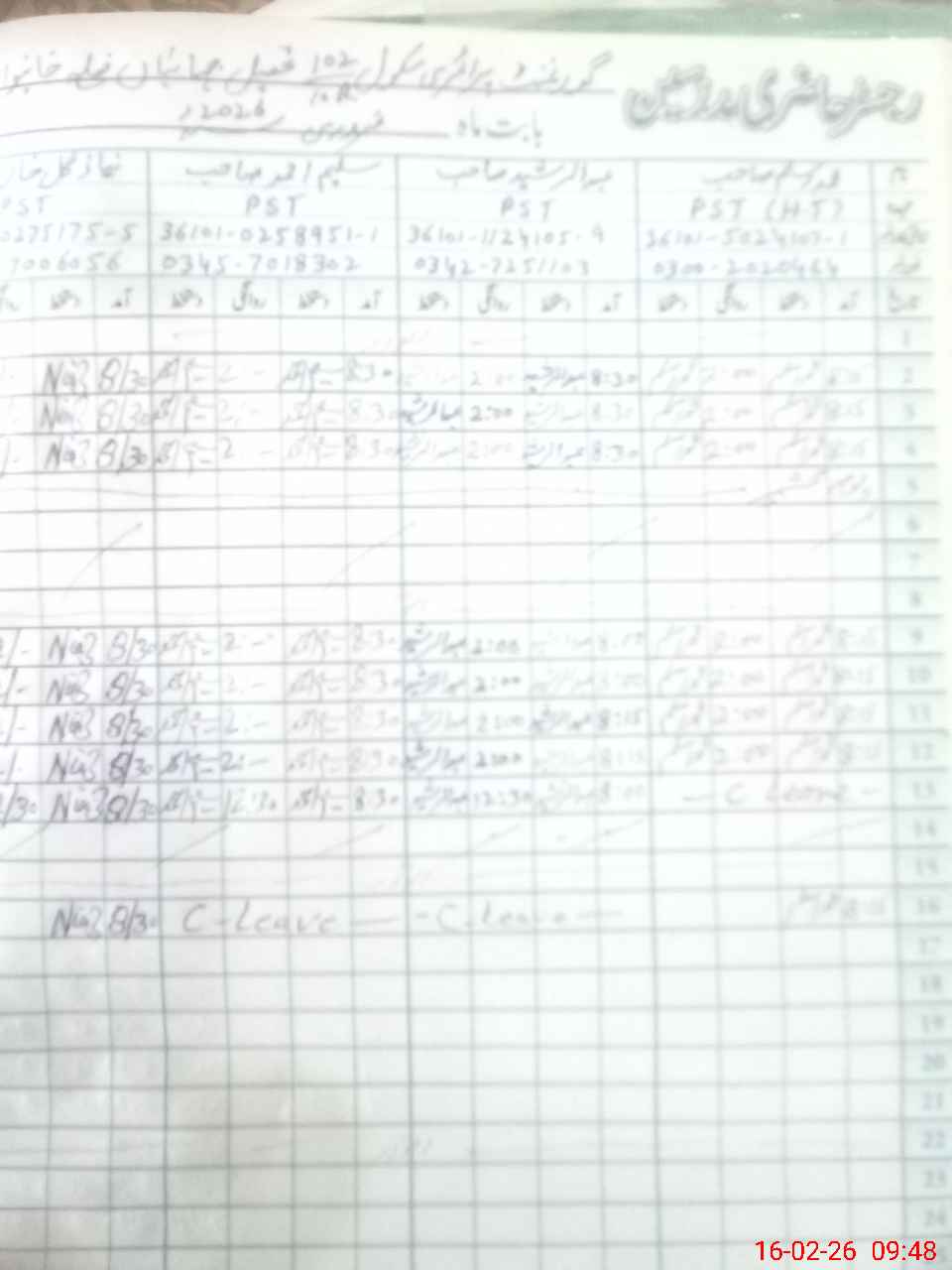 | CNIC | Full Name | Designation | R/C | Absence During Last Calender Month |