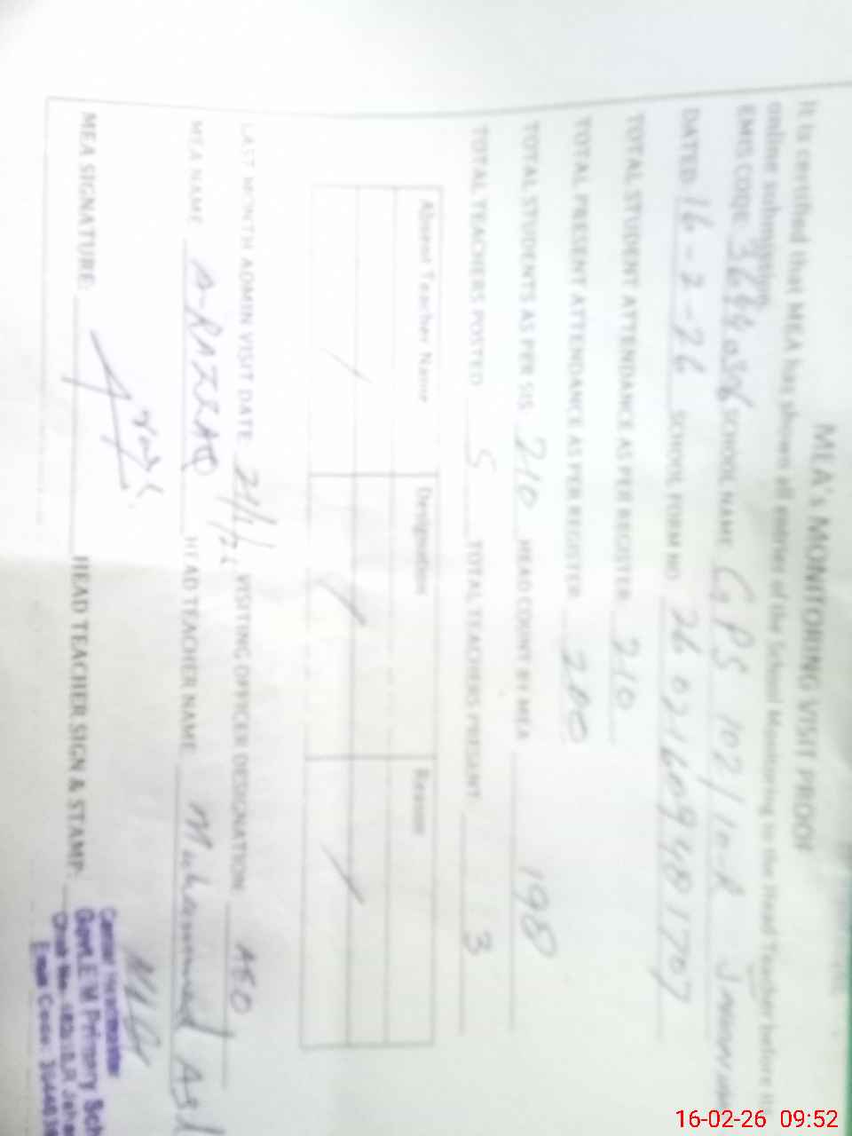 | Certified that this School was Inspected by the Undersigned MEA/DMO Today and the Information Stated Above is as Per Record. | |||||