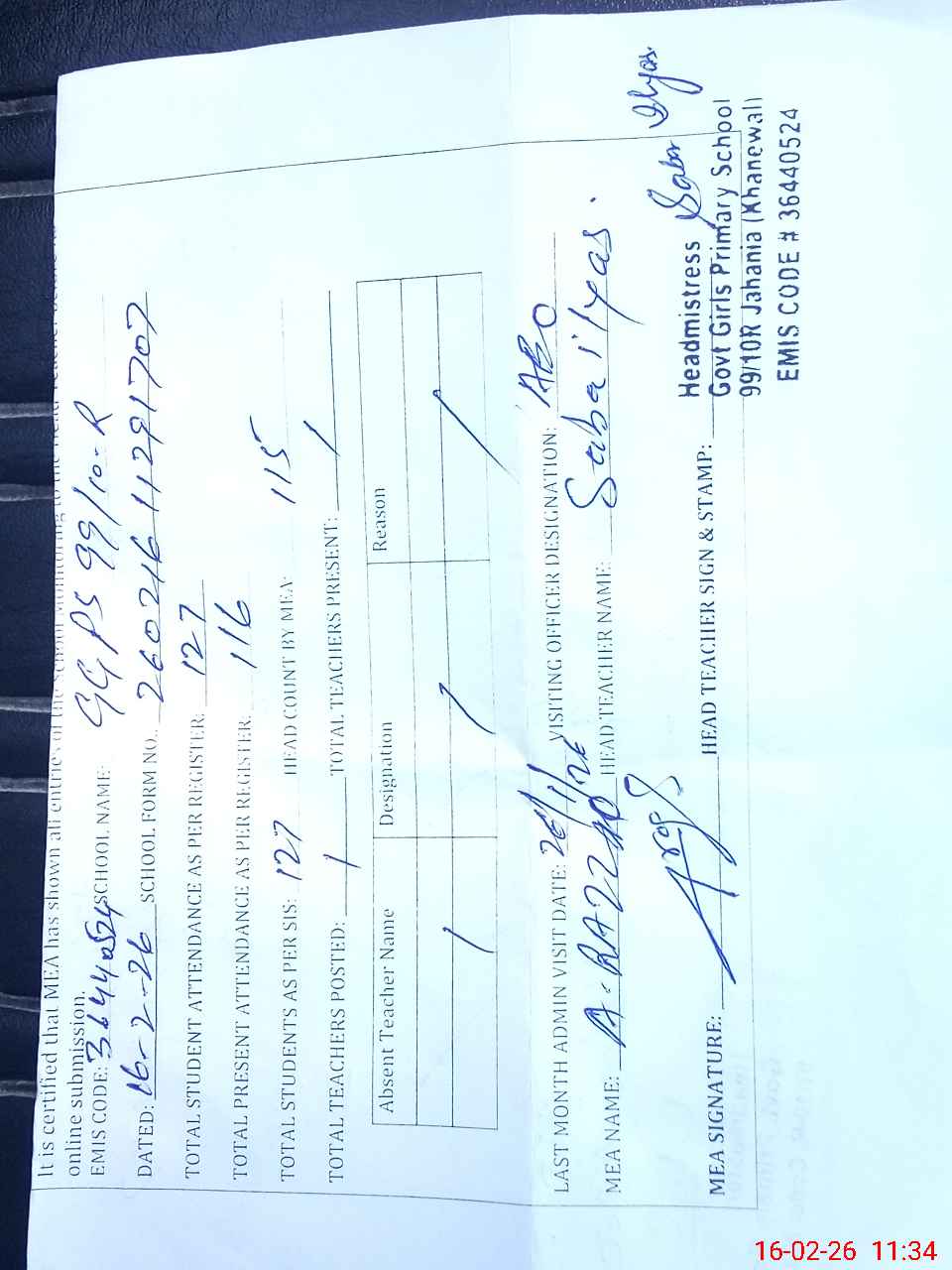 | Attendance Register | Head Teacher | MEA with School | Visit Proof |