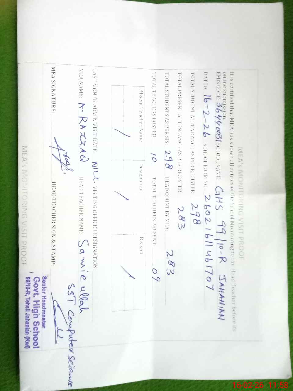 | EMIS Code: 36440031 | Name of School: GHS 99/10-R, JAHANIAN | |||