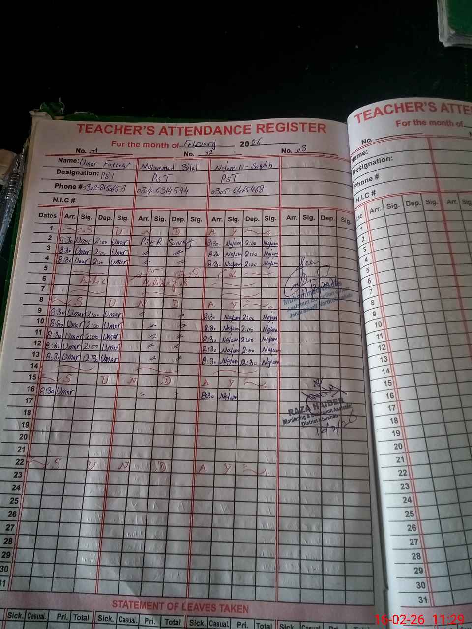 | CNIC | Full Name | Designation | R/C | Absence During Last Calender Month |