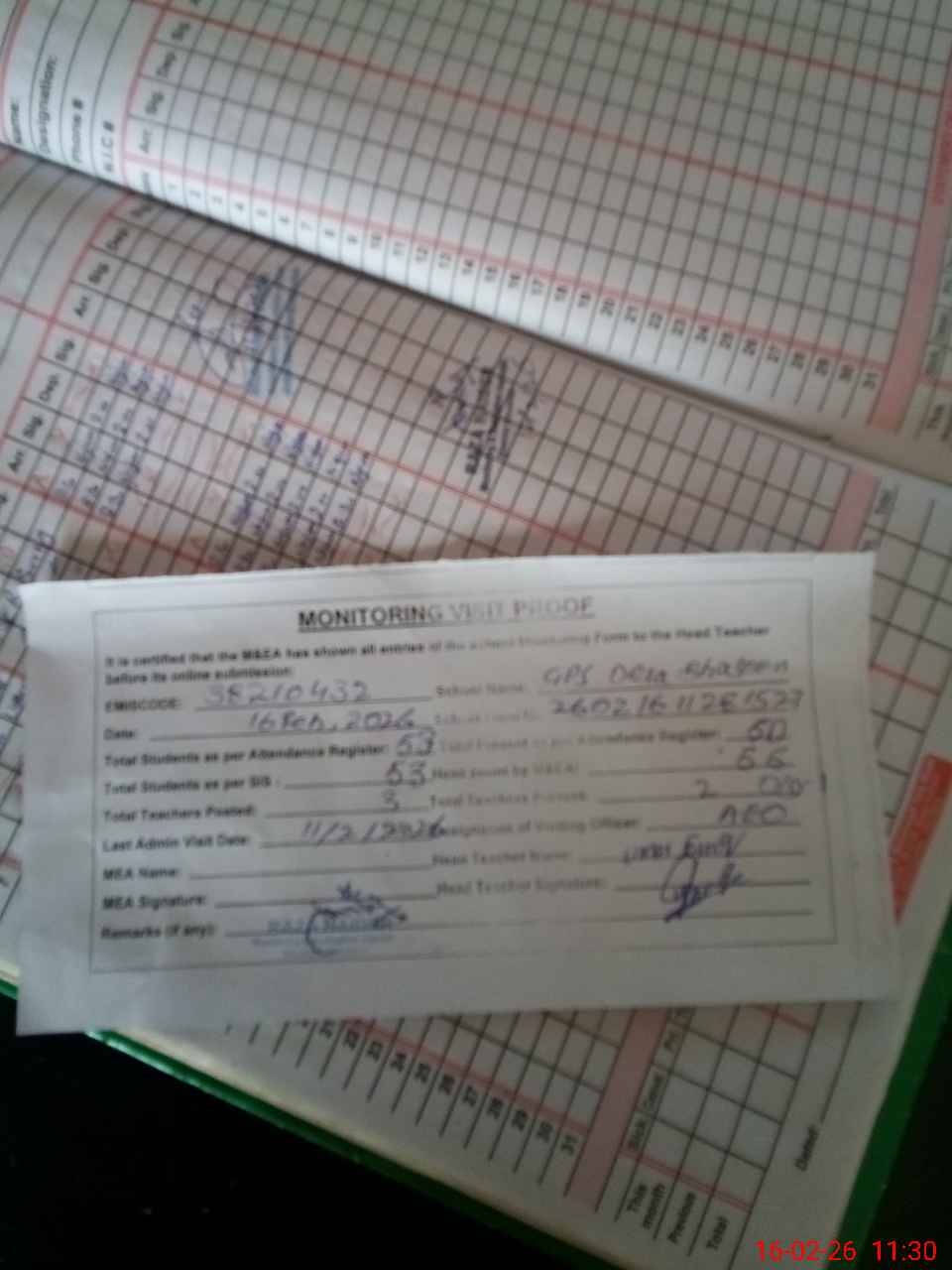 | Attendance Register | Head Teacher | MEA with School | Visit Proof |
