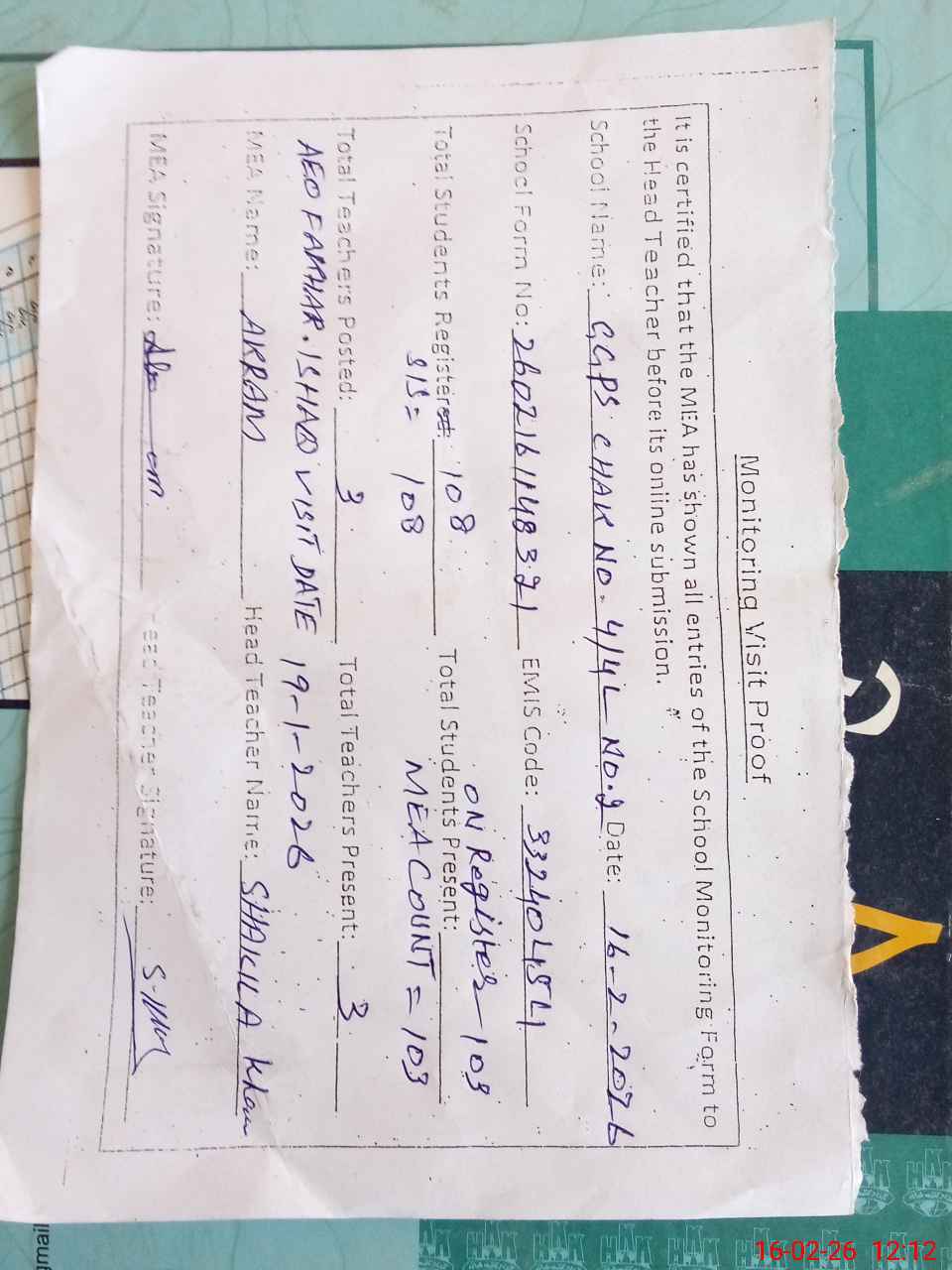 | Attendance Register | Head Teacher | MEA with School | Visit Proof |