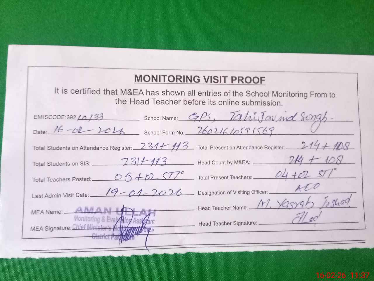 | Attendance Register | Head Teacher | MEA with School | Visit Proof |