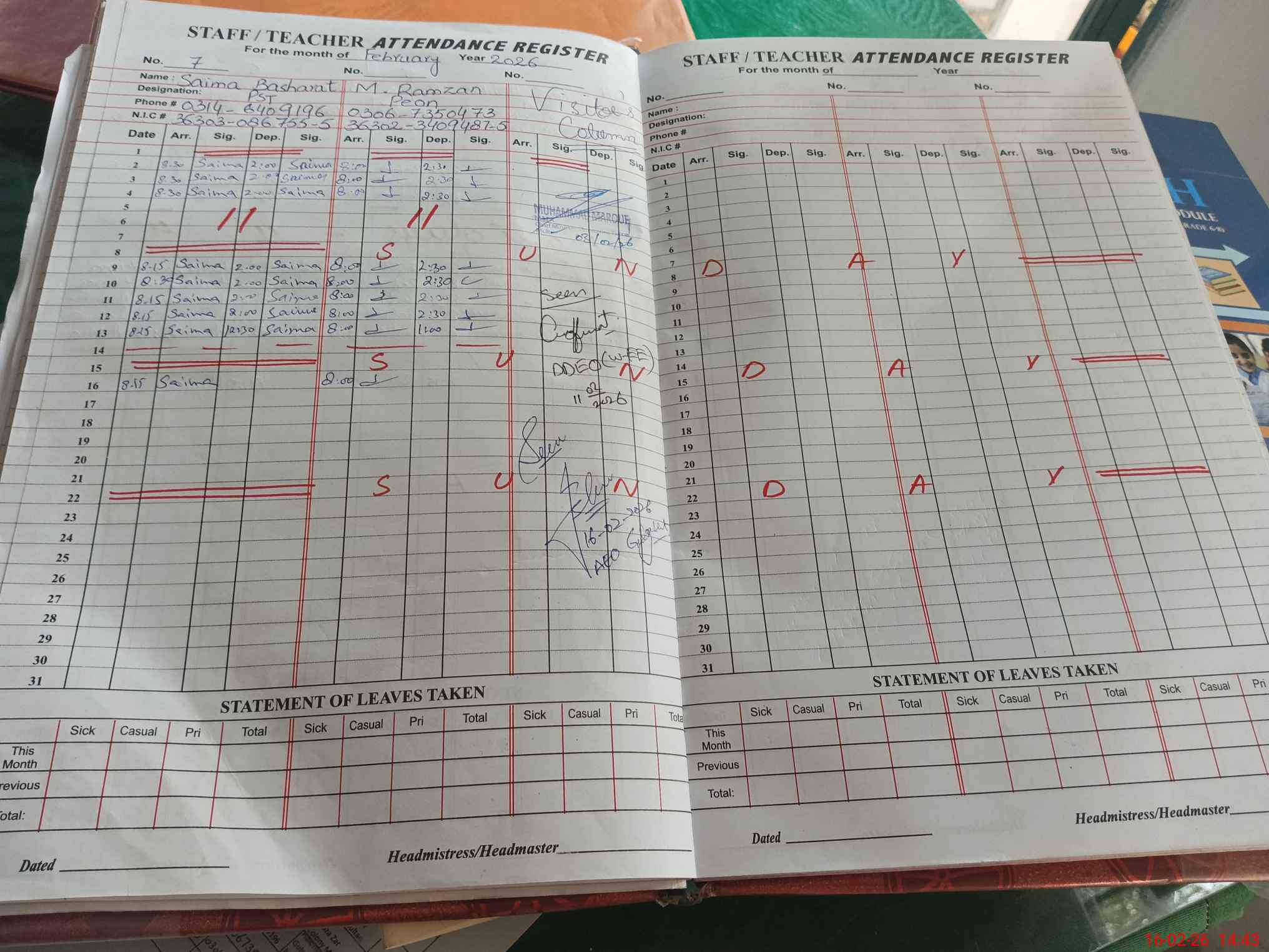 | Attendance Register | Head Teacher | MEA with School | Visit Proof |