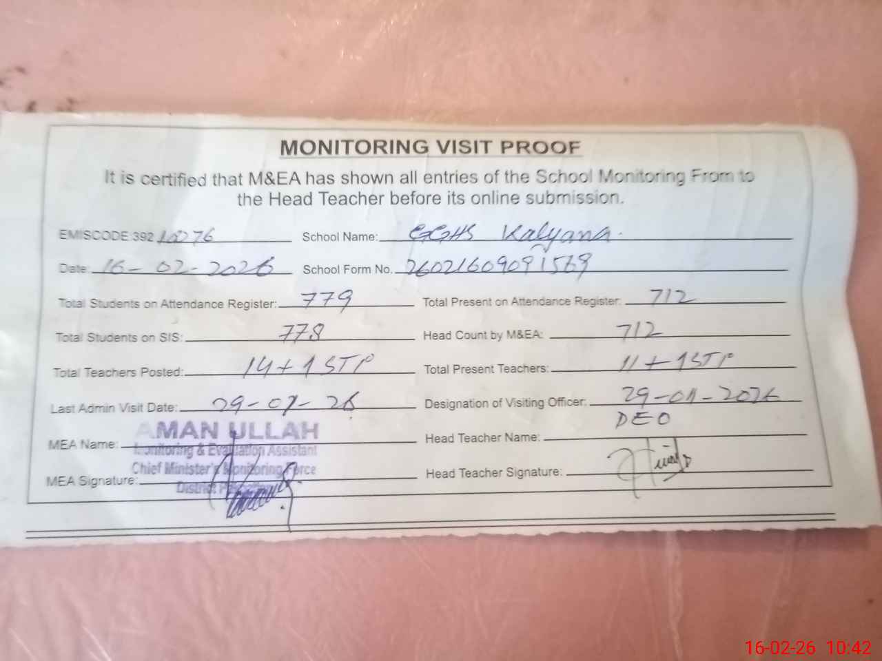 | Attendance Register | Head Teacher | MEA with School | Visit Proof |