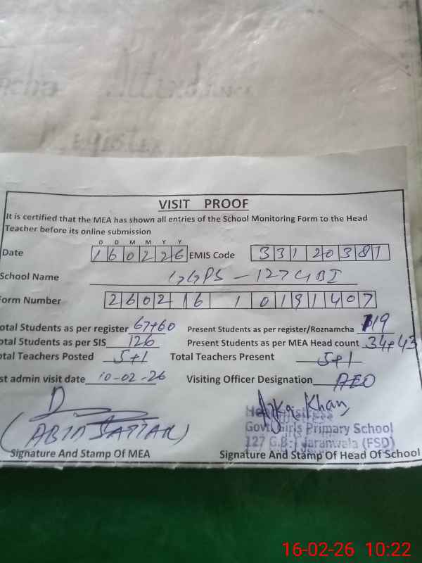 | EMIS Code: 33120381 | Name of School: GGPS CHAK 127 GB I JARANWALA | |||
