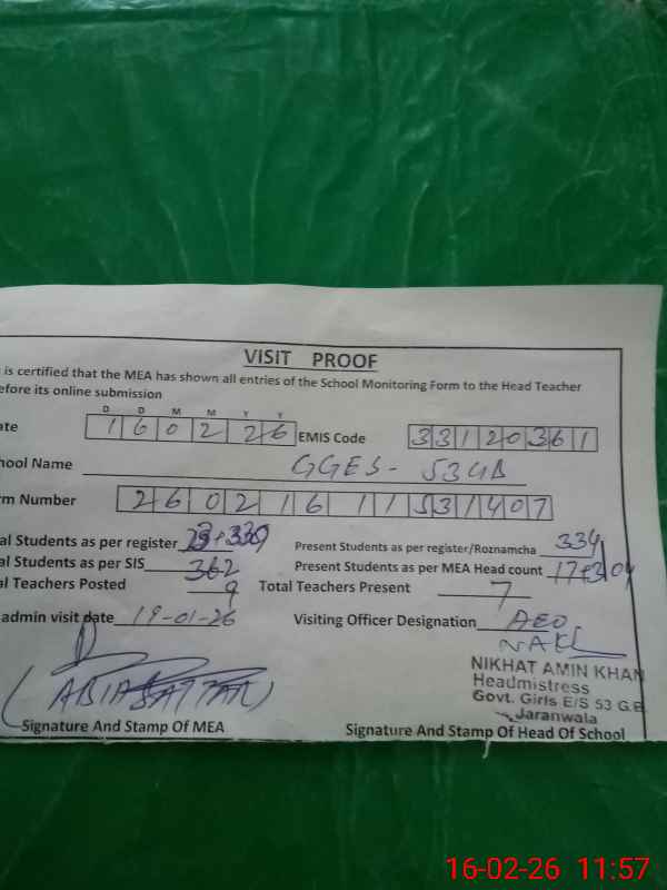 | EMIS Code: 33120361 | Name of School: GGES CHAK 53 GB JARANWALA | |||