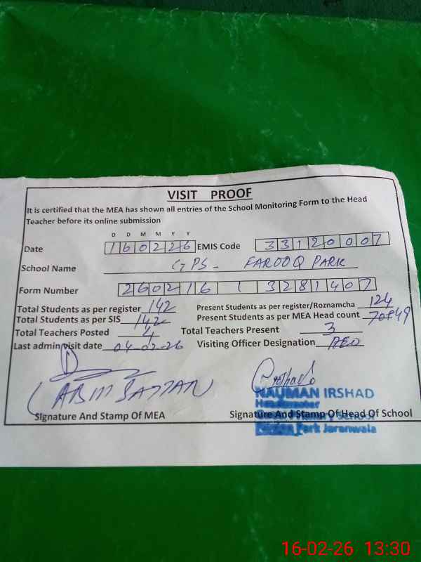 | EMIS Code: 33120007 | Name of School: GPS FAROOQ PARK JARANWALA | |||