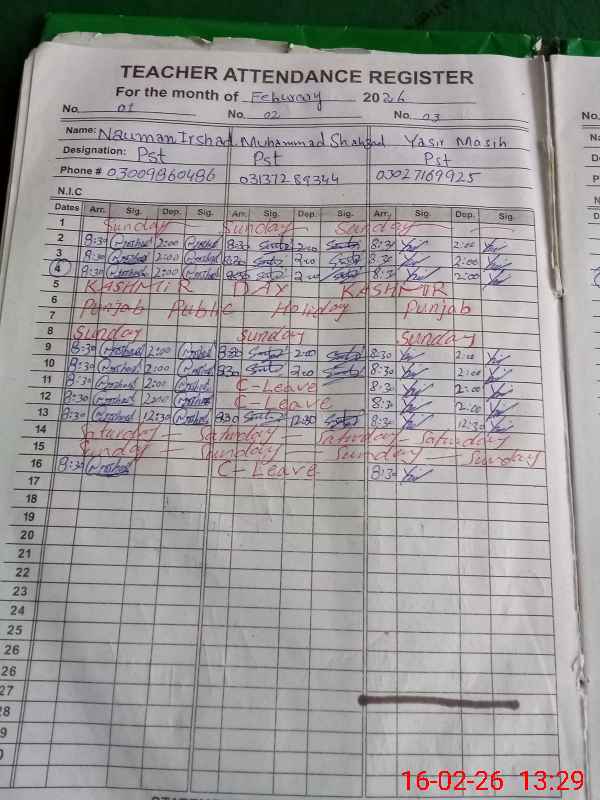 | Name: NA**** IR**** Designation: (School Headmaster's/Headmistress's) ESE (S/M) Phone/Cell Number: 03**** |