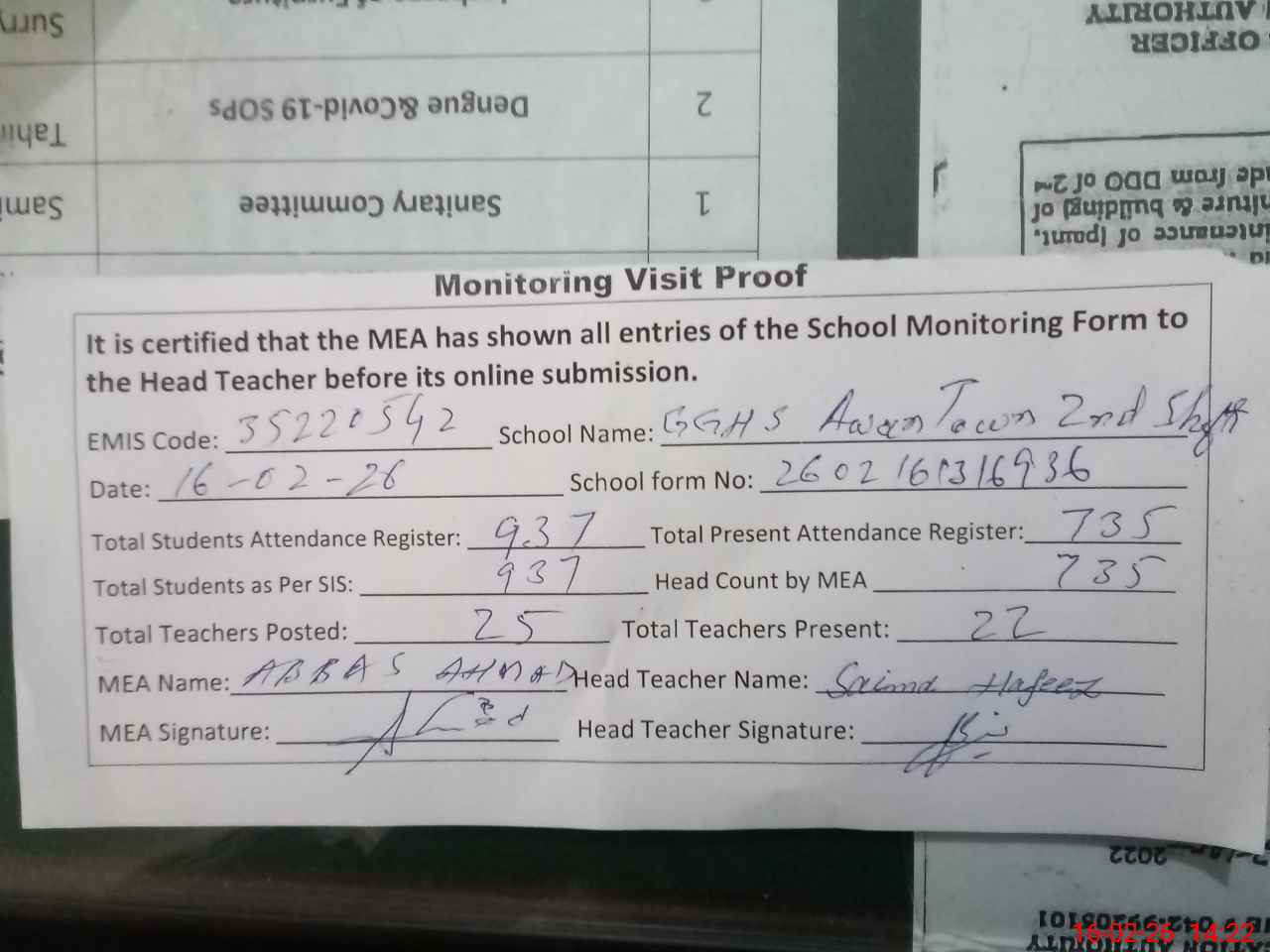 | Attendance Register | Head Teacher | MEA with School | Visit Proof |