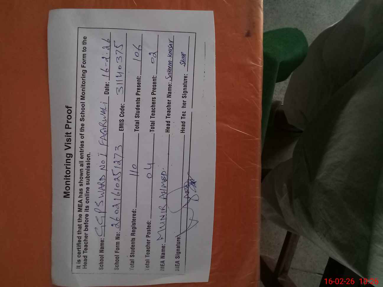 | Attendance Register | Head Teacher | MEA with School | Visit Proof |