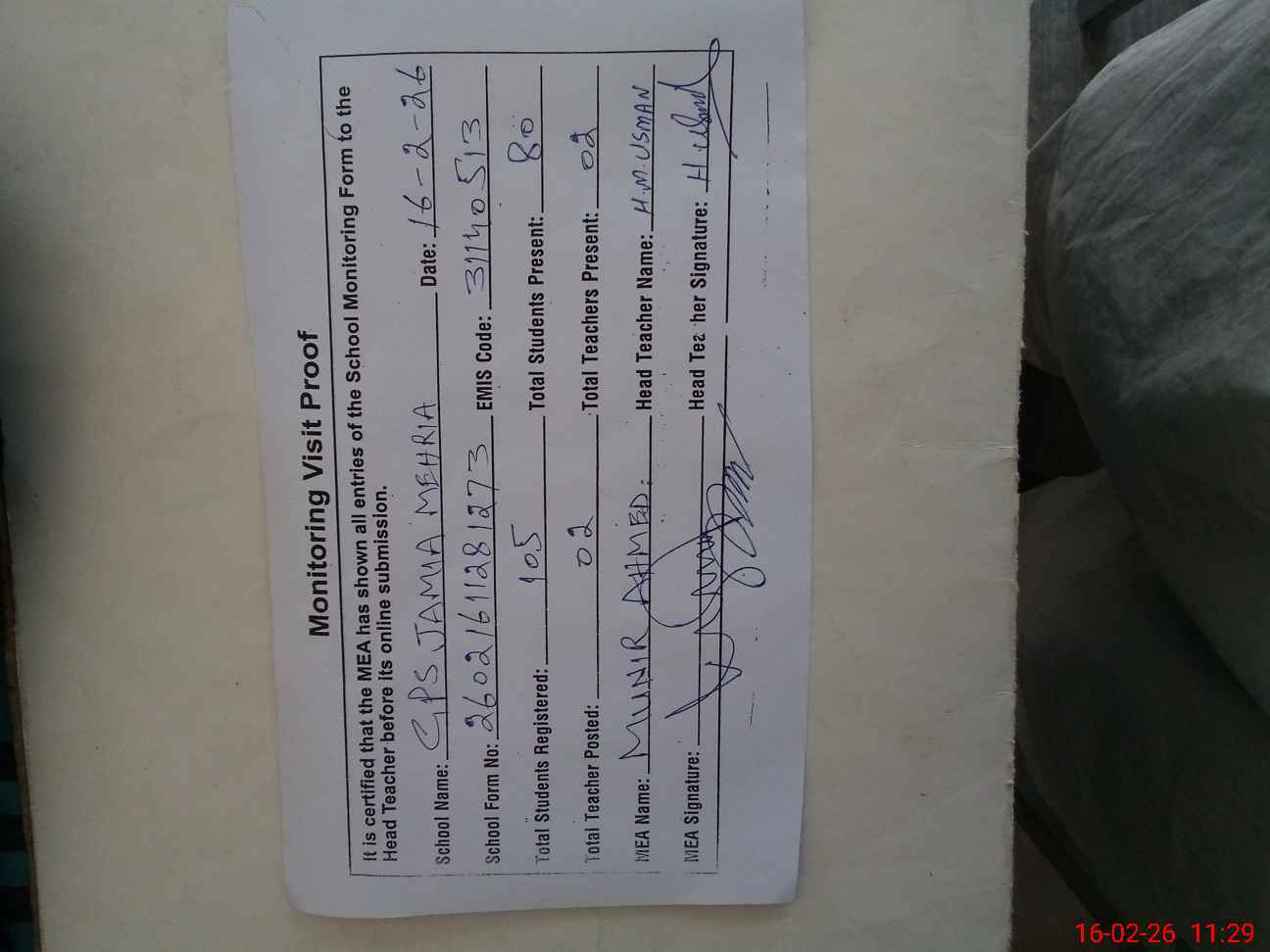 | Attendance Register | Head Teacher | MEA with School | Visit Proof |