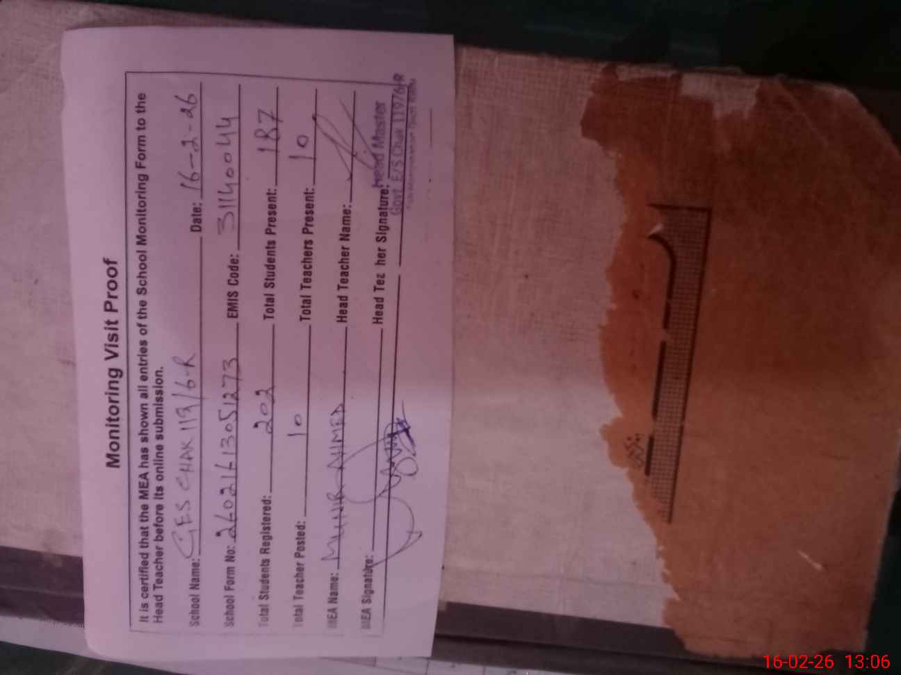 | Attendance Register | Head Teacher | MEA with School | Visit Proof |