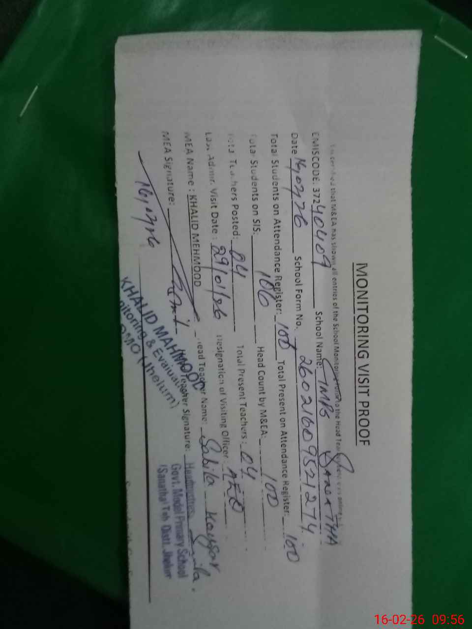 | Attendance Register | Head Teacher | MEA with School | Visit Proof |