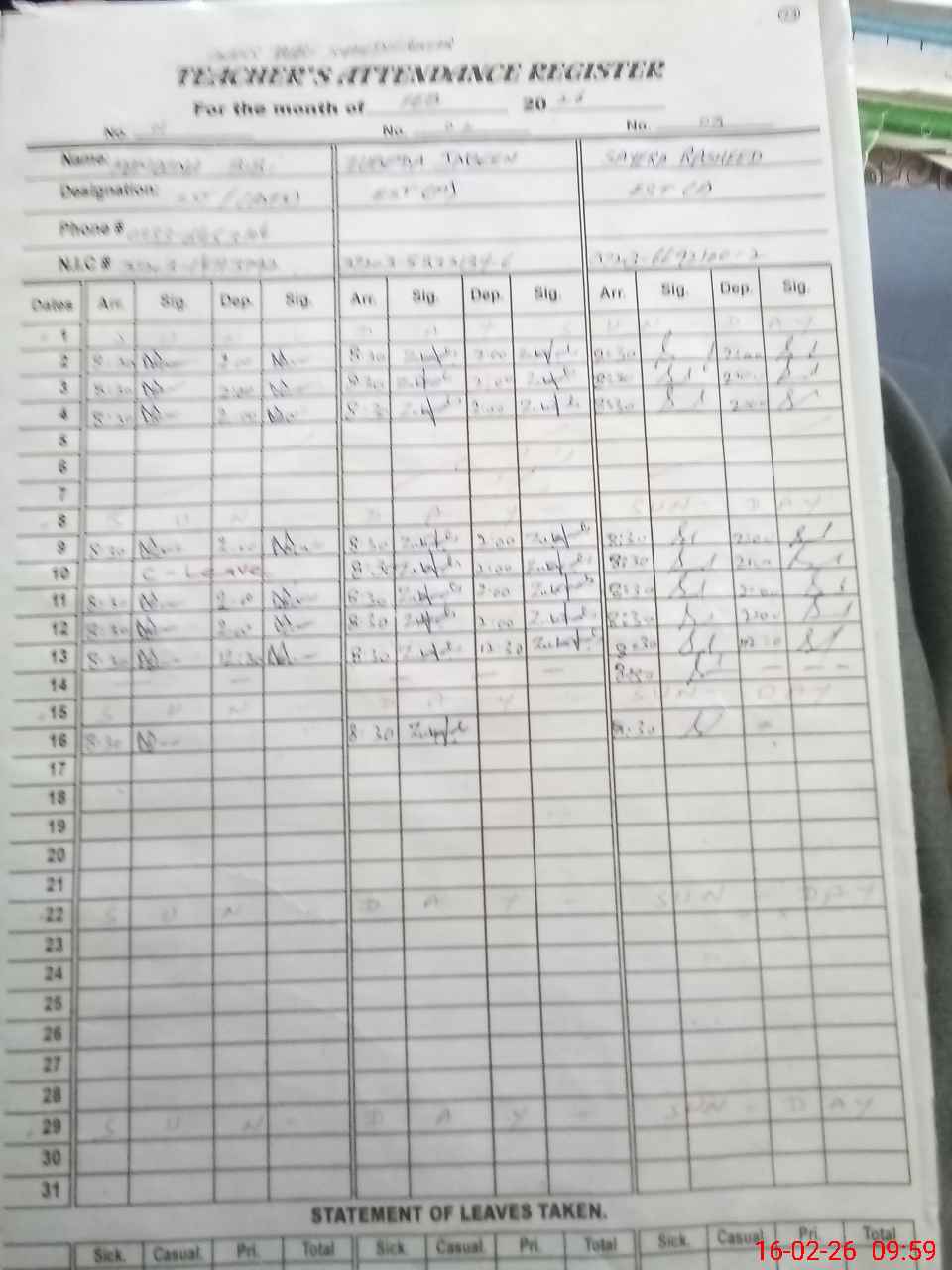 | CNIC | Full Name | Designation | R/C | Absence During Last Calender Month |