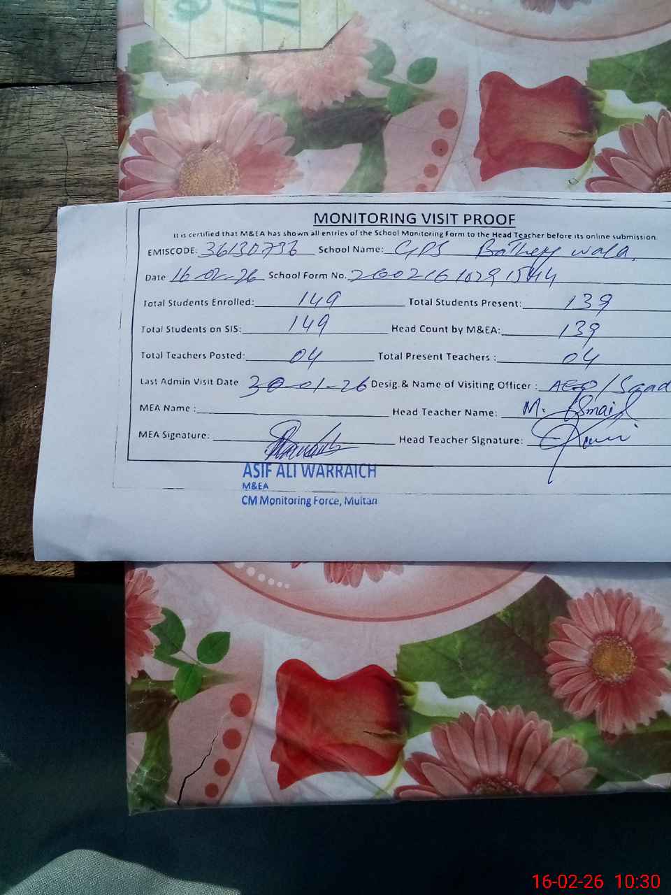 | EMIS Code: 36130736 | Name of School: GPS BATHEY WALA MULTAN | |||