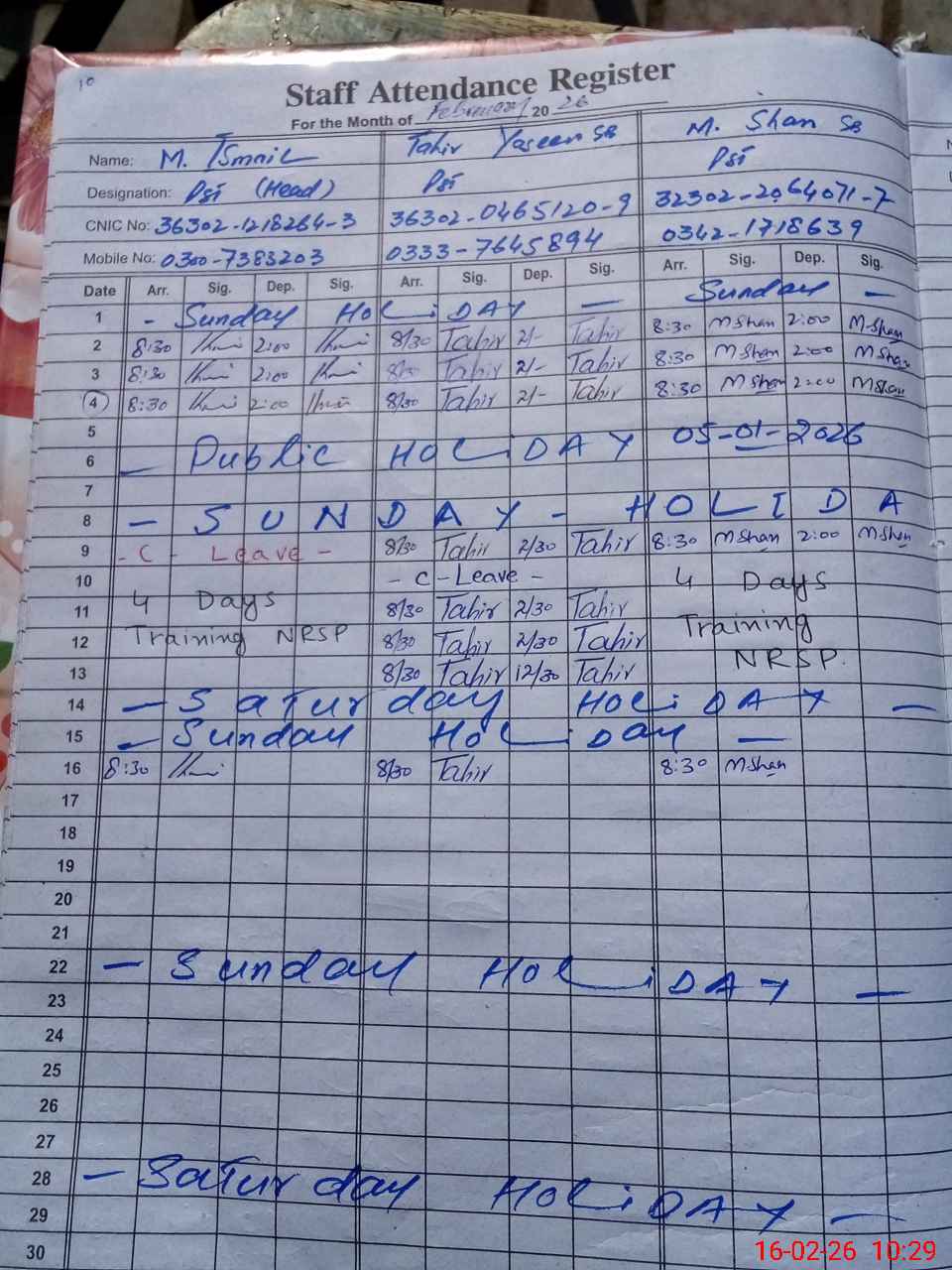 | CNIC | Full Name | Designation | R/C | Absence During Last Calender Month |