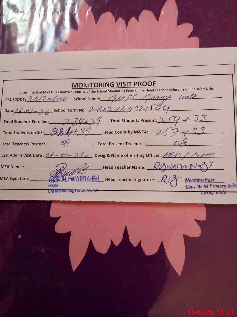 | EMIS Code: 36130600 | Name of School: GMPS GAREY WALA MULTAN | |||