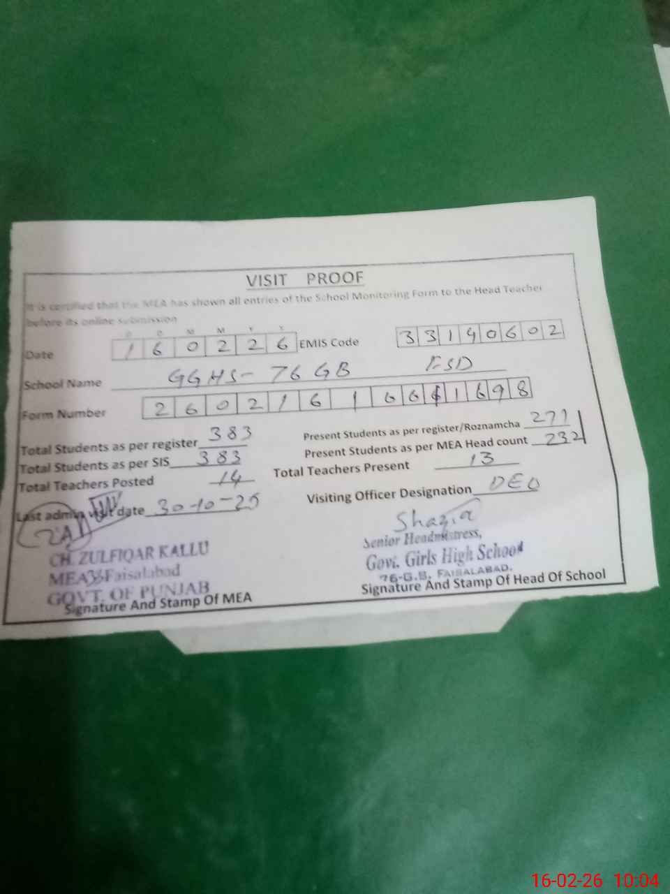 | Certified that this School was Inspected by the Undersigned MEA/DMO Today and the Information Stated Above is as Per Record. | |||||