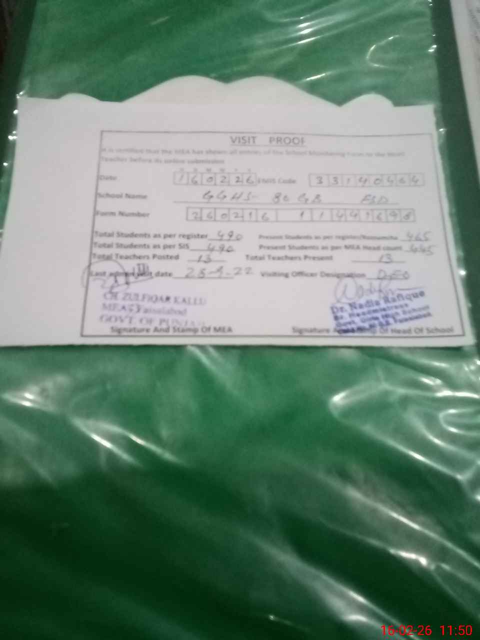 | Certified that this School was Inspected by the Undersigned MEA/DMO Today and the Information Stated Above is as Per Record. | |||||