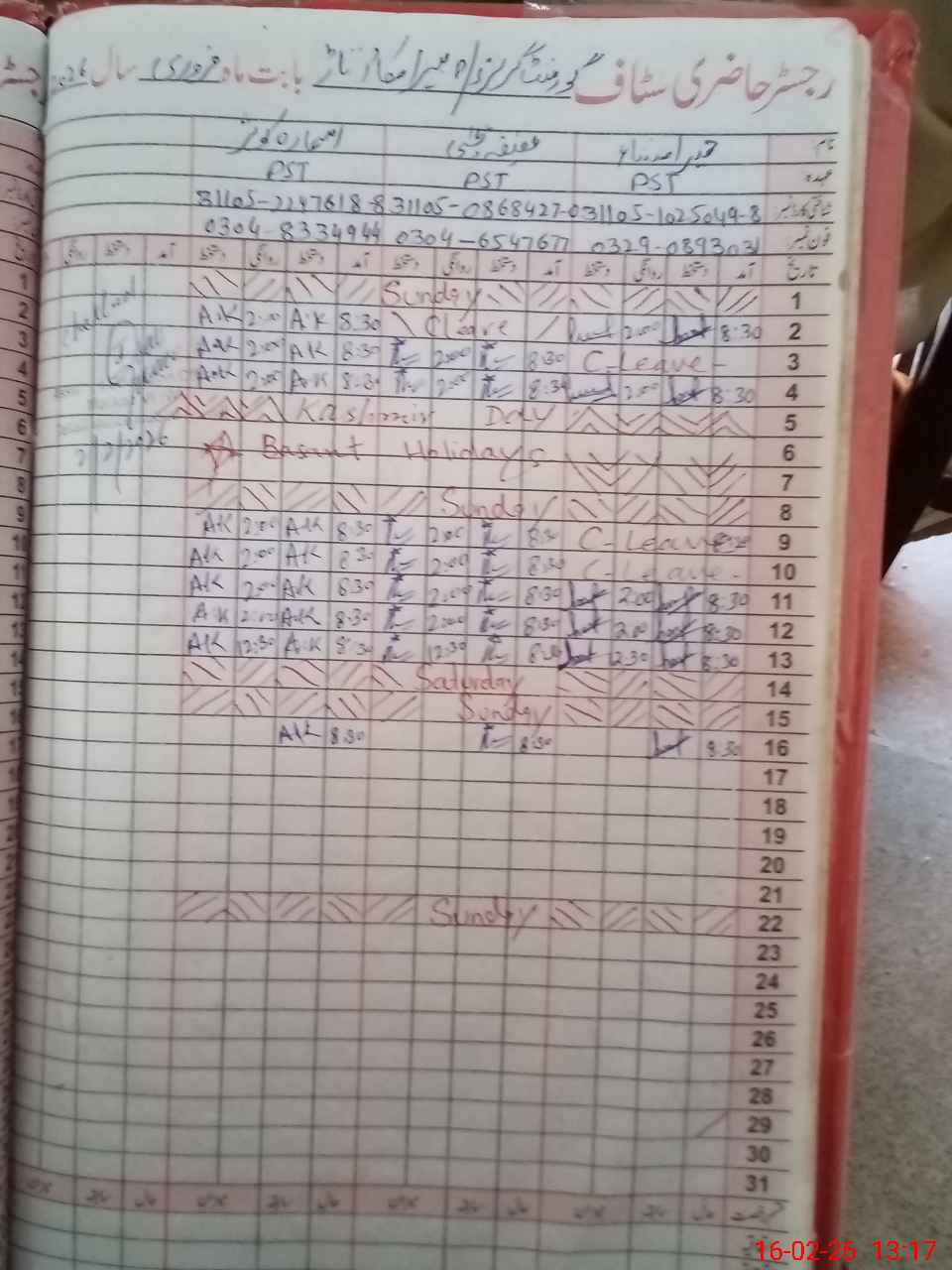 | CNIC | Full Name | Designation | R/C | Absence During Last Calender Month |