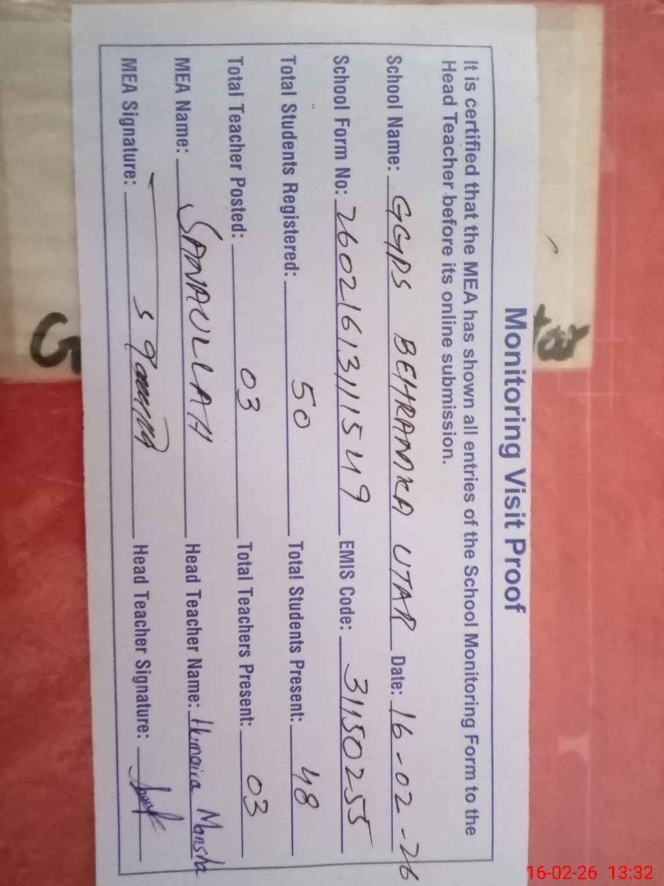 | Attendance Register | Head Teacher | MEA with School | Visit Proof |