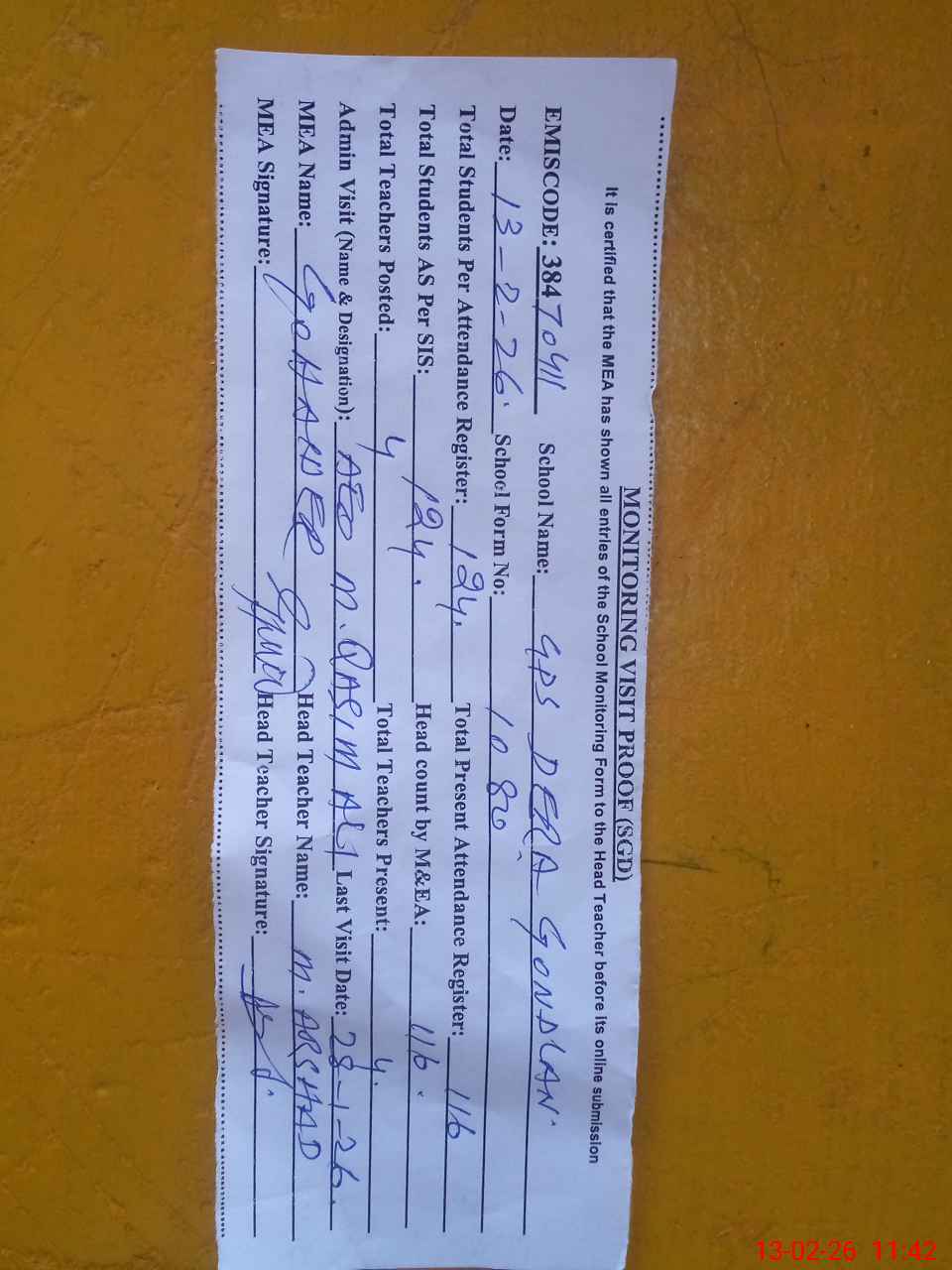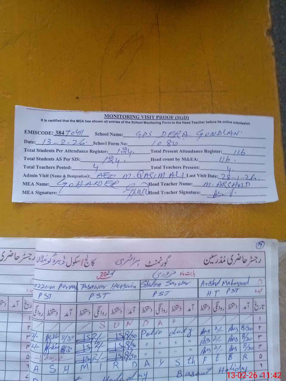 | Attendance Register | Head Teacher | MEA with School | Visit Proof |