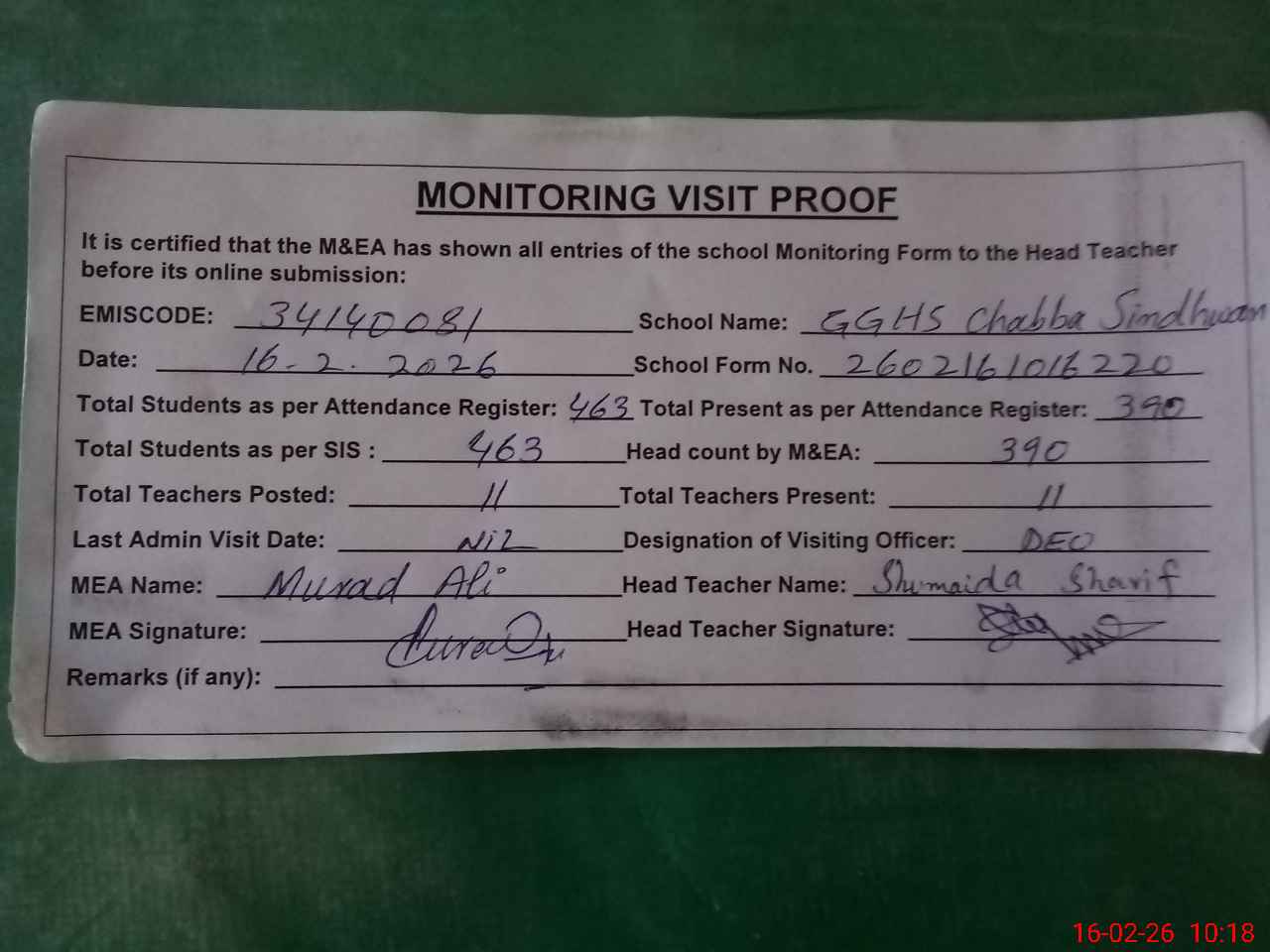 | Attendance Register | Head Teacher | MEA with School | Visit Proof |