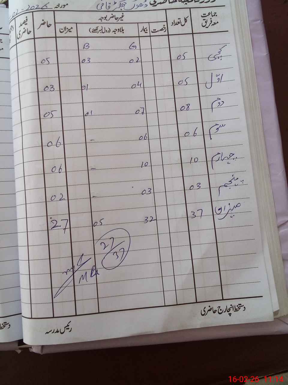 | Total Students Present | 0 | 0 | 3 | 5 | 6 | 6 | 2 | 27 | ||||||||