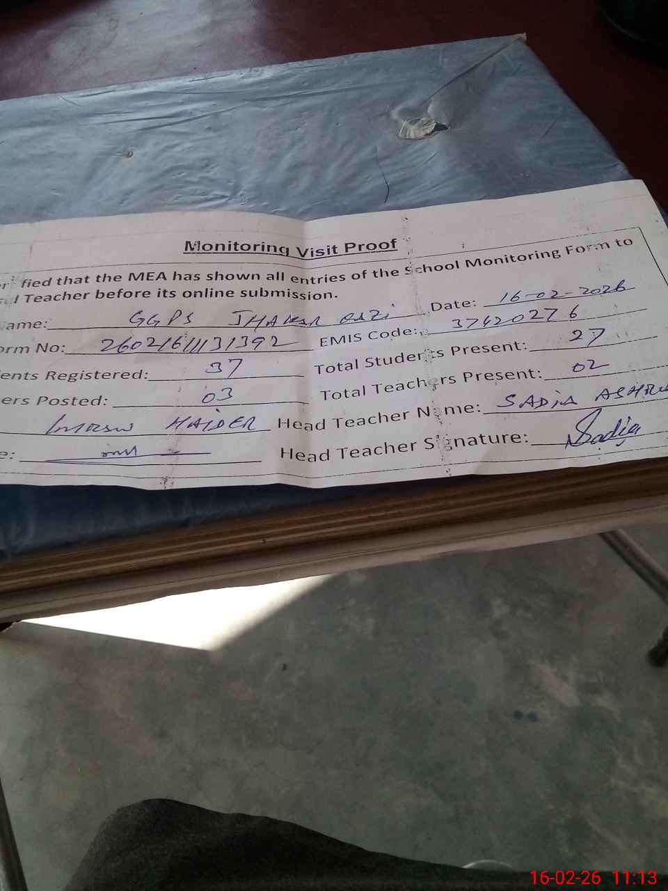 | Attendance Register | Head Teacher | MEA with School | Visit Proof |