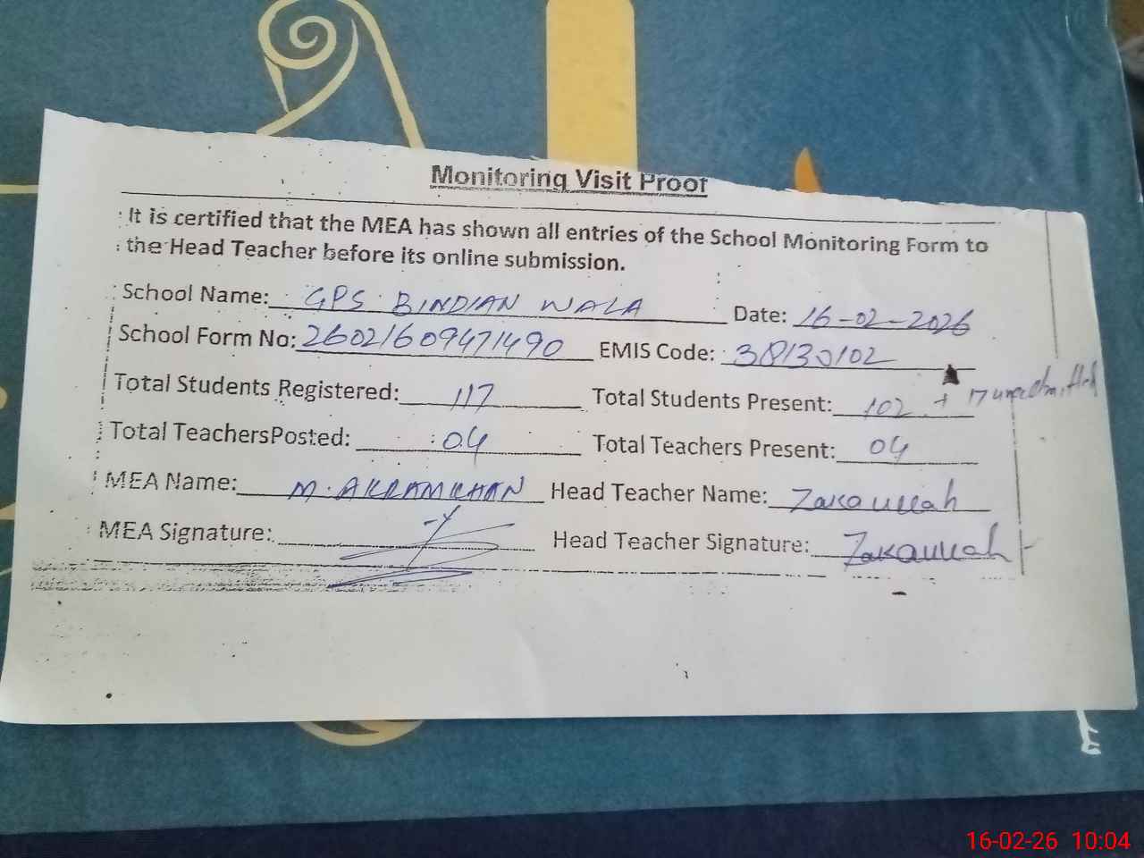 | Attendance Register | Head Teacher | MEA with School | Visit Proof |