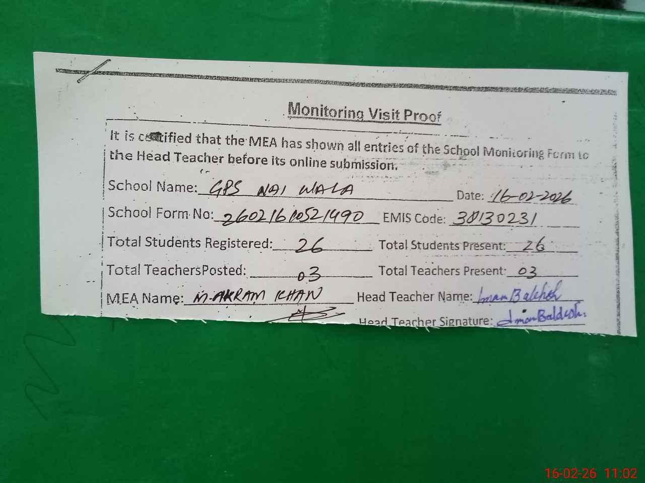 | Attendance Register | Head Teacher | MEA with School | Visit Proof |