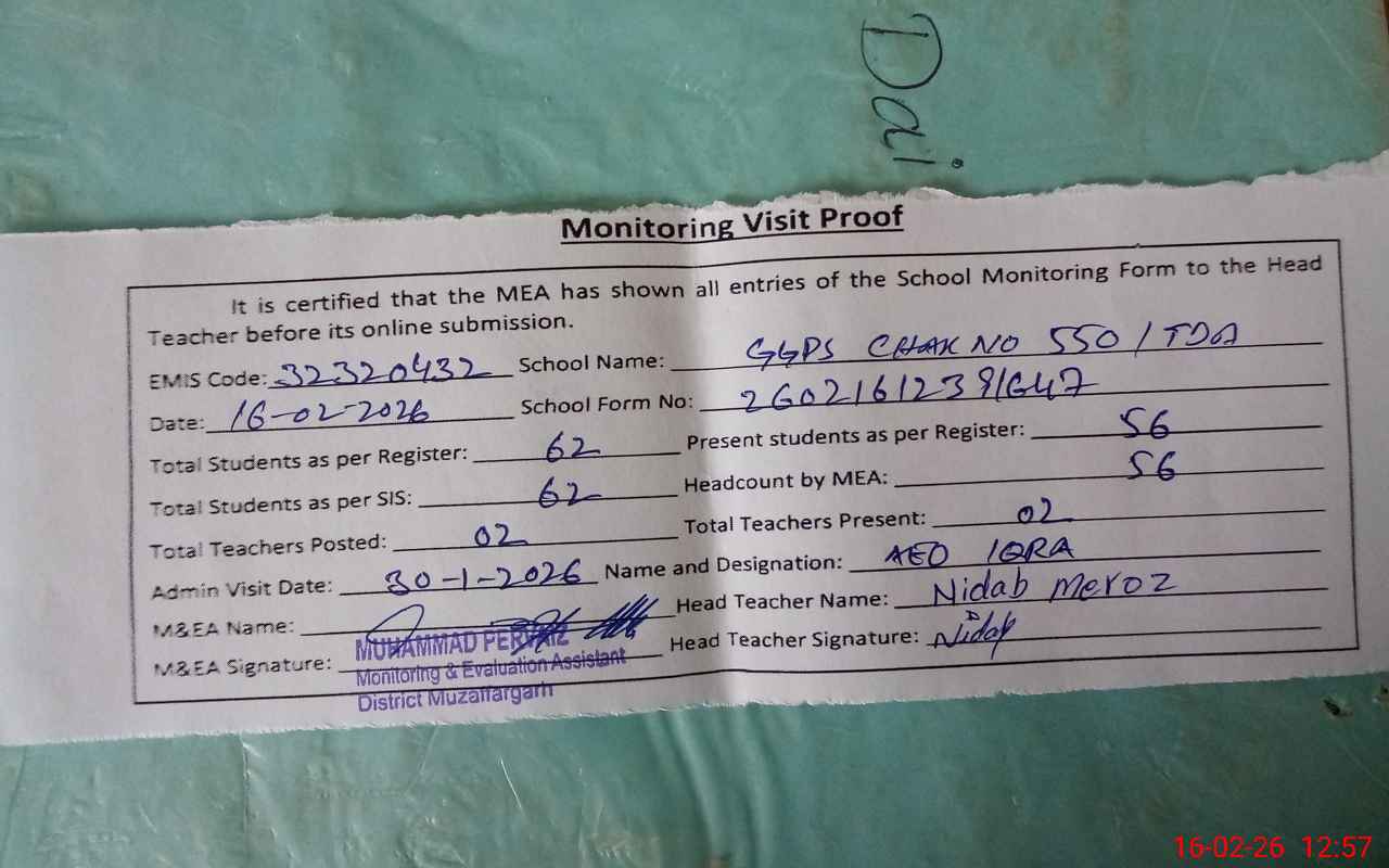 | EMIS Code: 32320432 | Name of School: GGPS CHAK NO. 550 TDA | |||