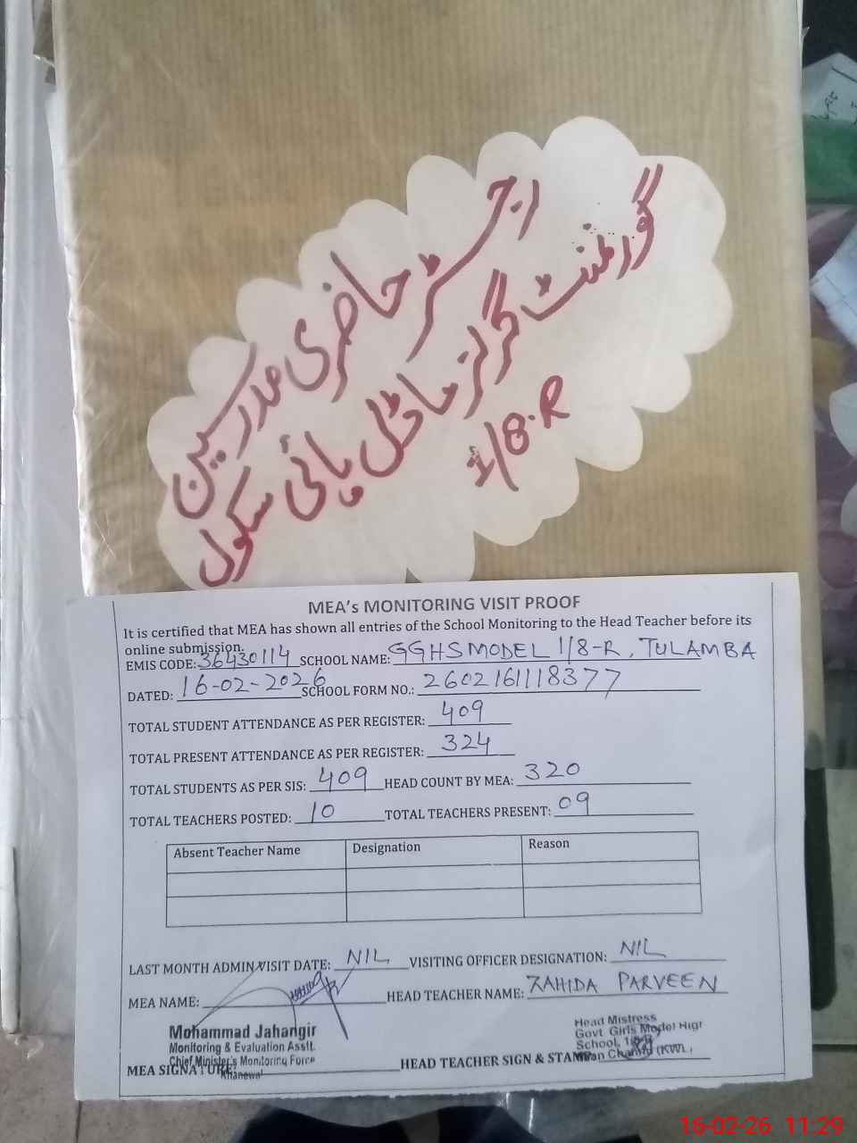 | Attendance Register | Head Teacher | MEA with School | Visit Proof |