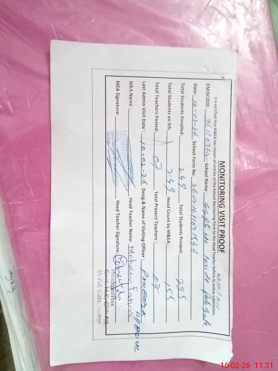 | Certified that this School was Inspected by the Undersigned MEA/DMO Today and the Information Stated Above is as Per Record. | |||||
