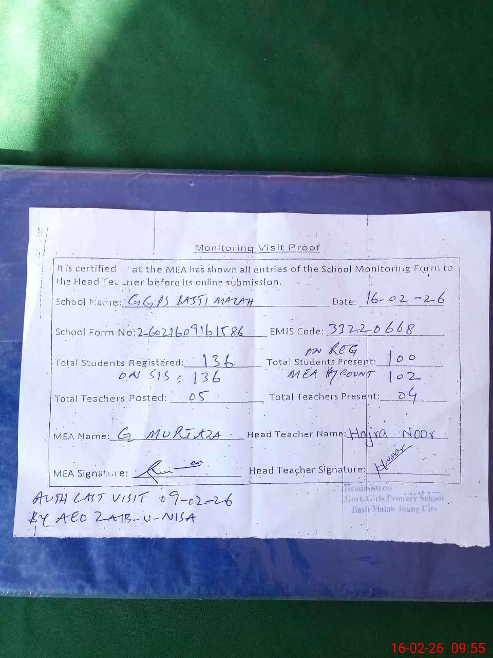 | Attendance Register | Head Teacher | MEA with School | Visit Proof |