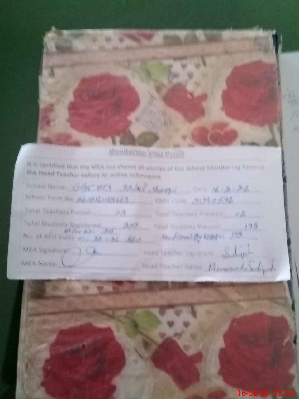| Attendance Register | Head Teacher | MEA with School | Visit Proof |