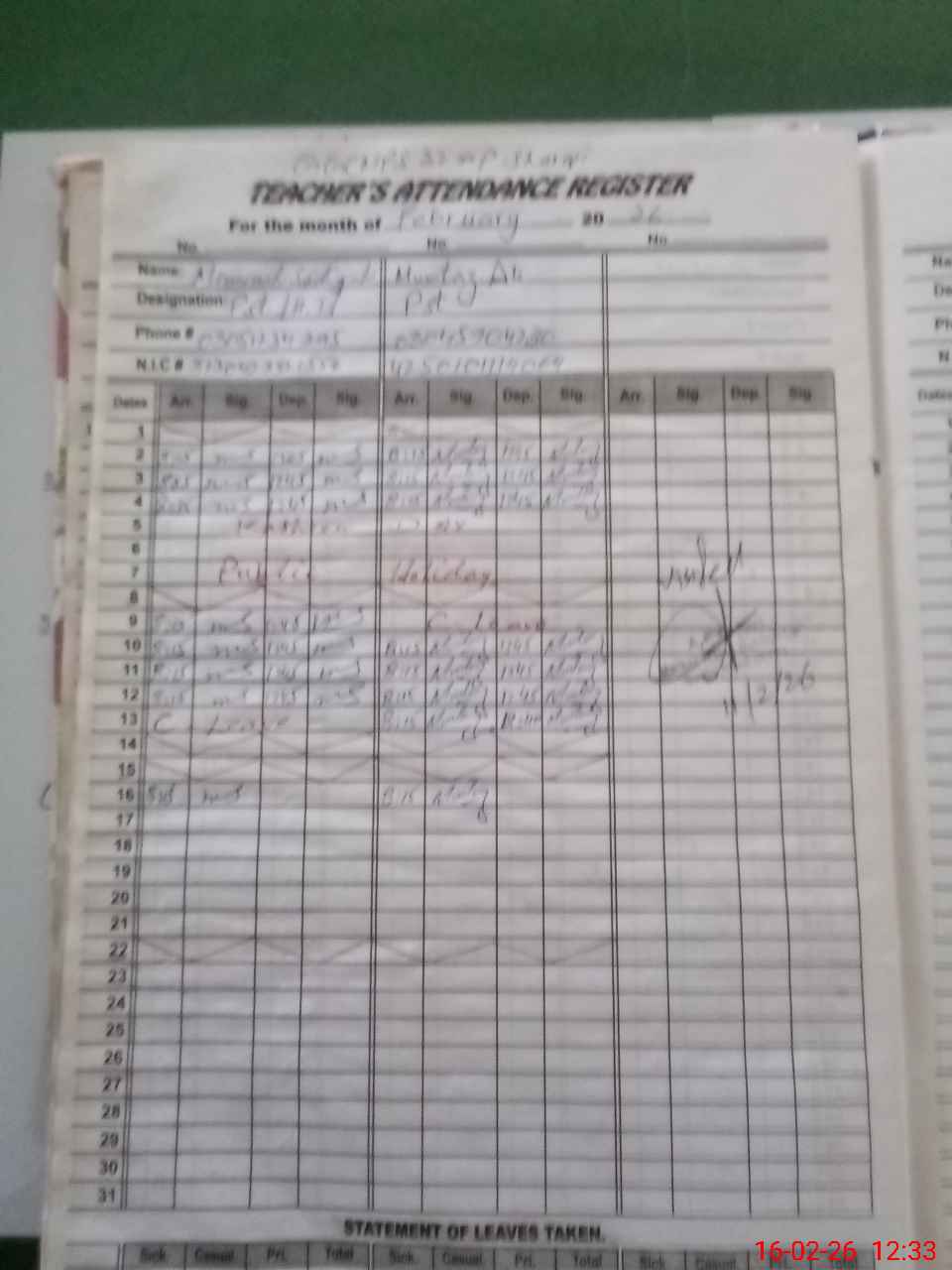 | CNIC | Full Name | Designation | R/C | Absence During Last Calender Month |