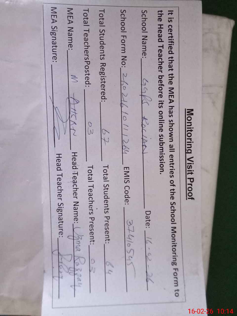 | Attendance Register | Head Teacher | MEA with School | Visit Proof |