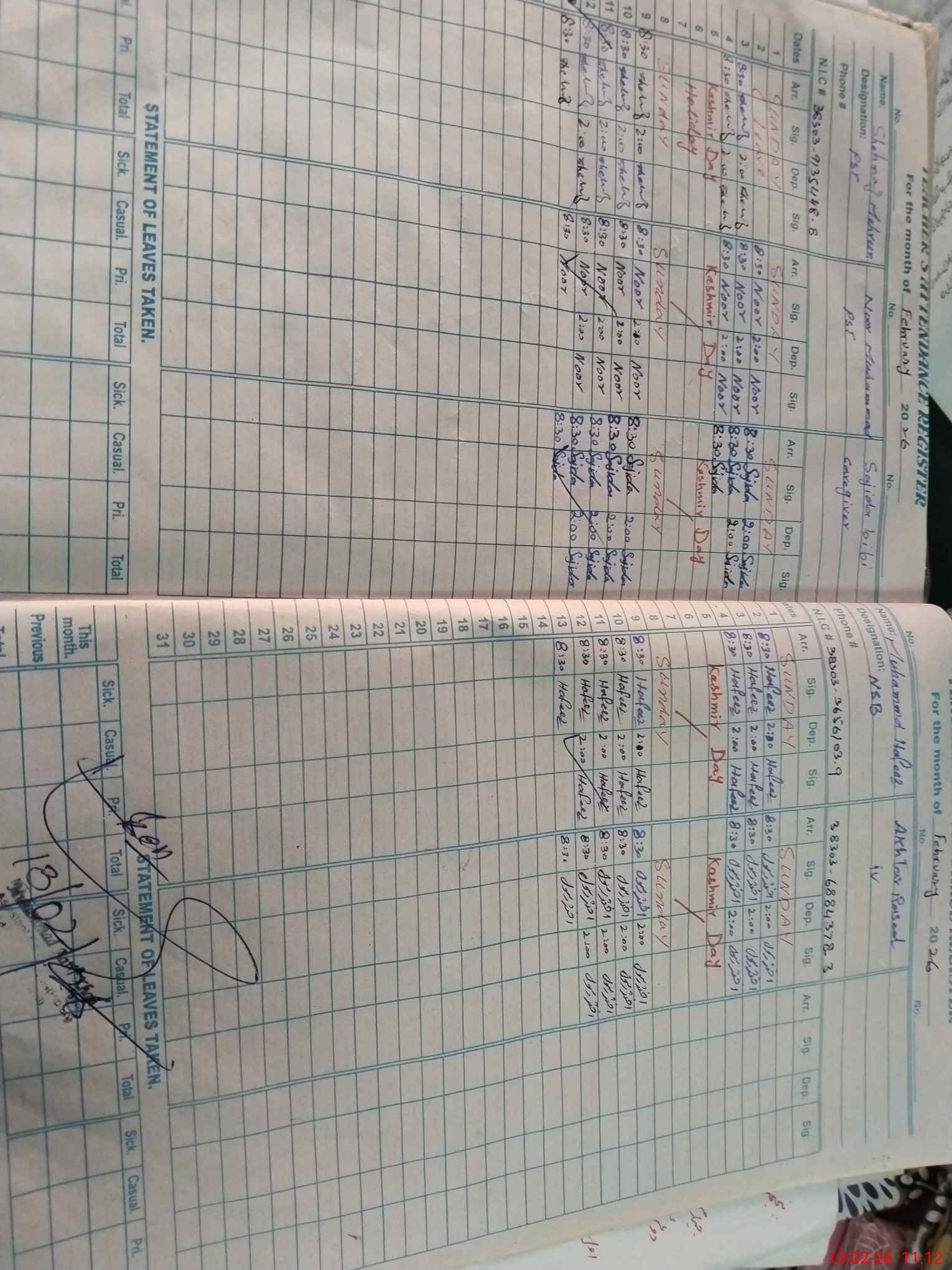 | CNIC | Full Name | Designation | R/C | Absence During Last Calender Month |