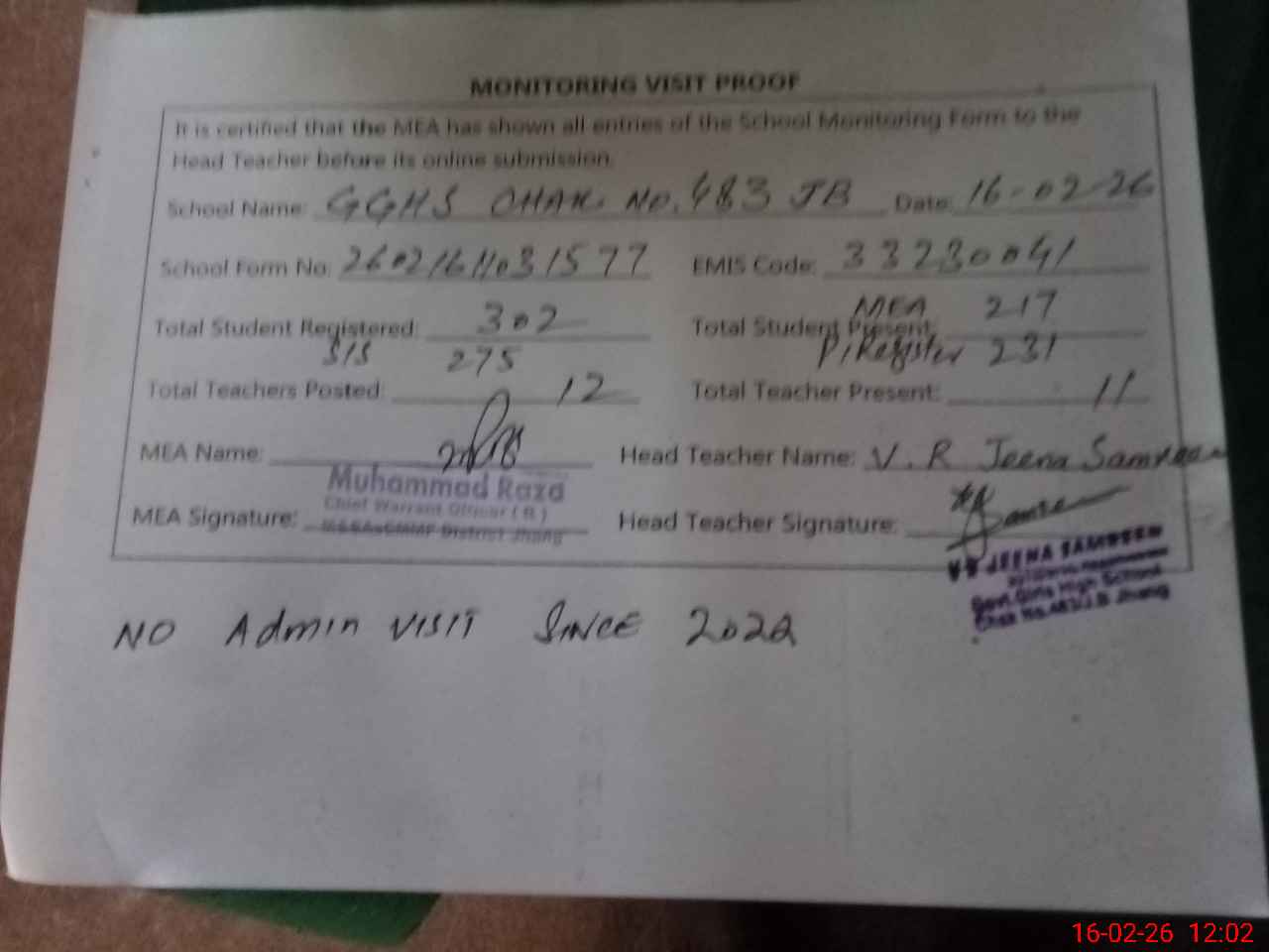 | EMIS Code: 33230041 | Name of School: GGHS CHAK NO 483 JB | |||