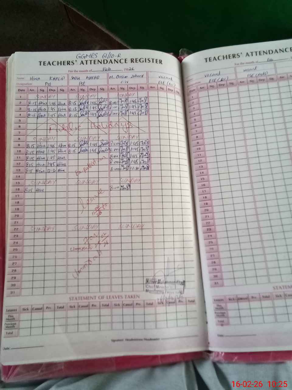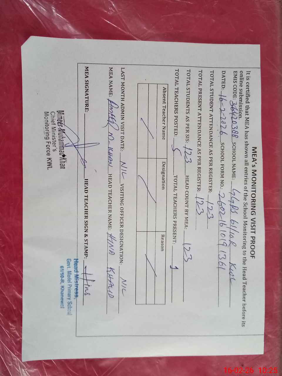 | Remarks (Use Separate Page if Required): NSB account on school SIS updated till last month but on MEA TAB shown May 2025 previous year No AEO Visit in previous month No second shift in school now Attendance of class 8 given on MEA Tab presently not in school as school is working only in morning shift in primary level | |||||