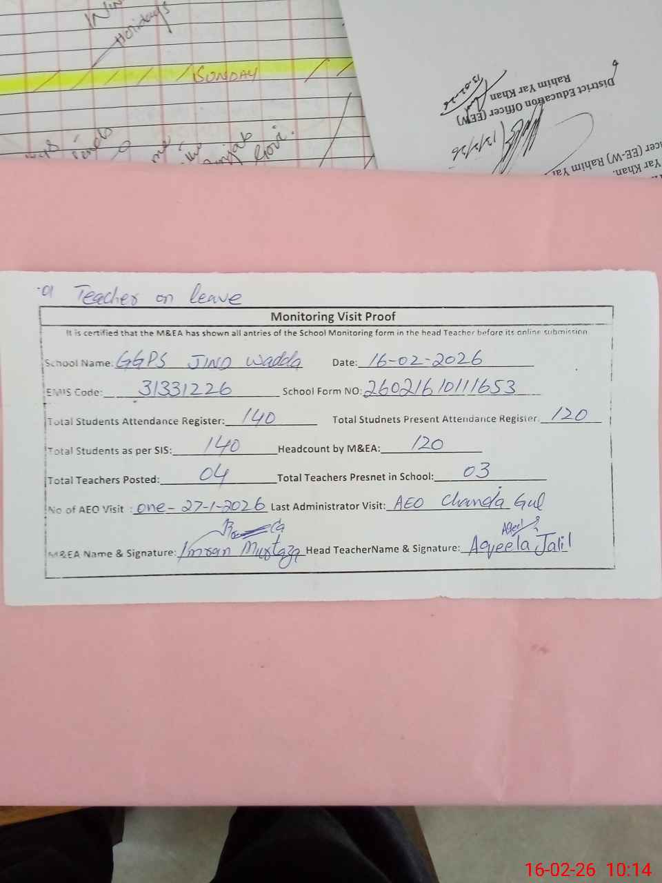| Attendance Register | Head Teacher | MEA with School | Visit Proof |
