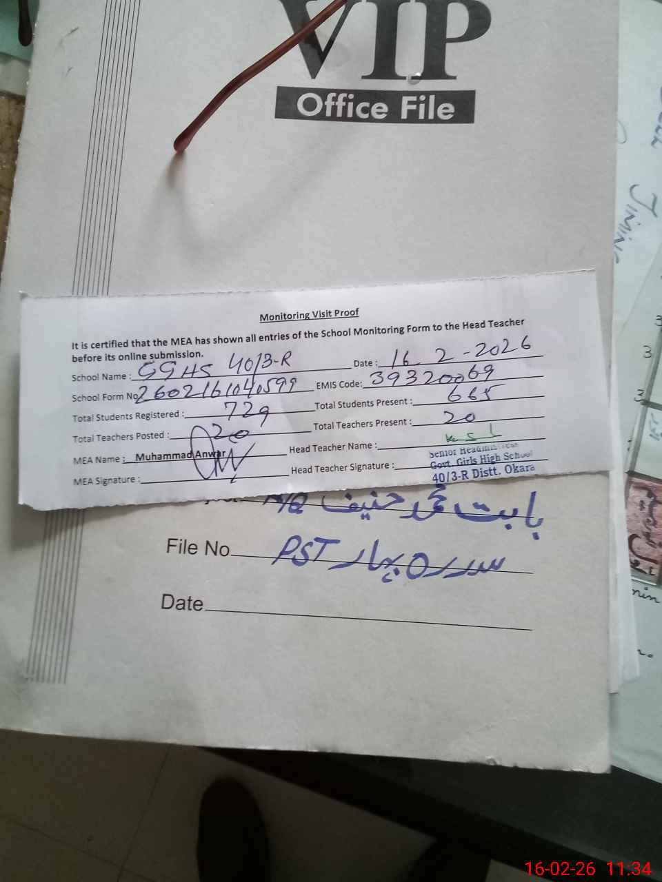 | Certified that this School was Inspected by the Undersigned MEA/DMO Today and the Information Stated Above is as Per Record. | |||||